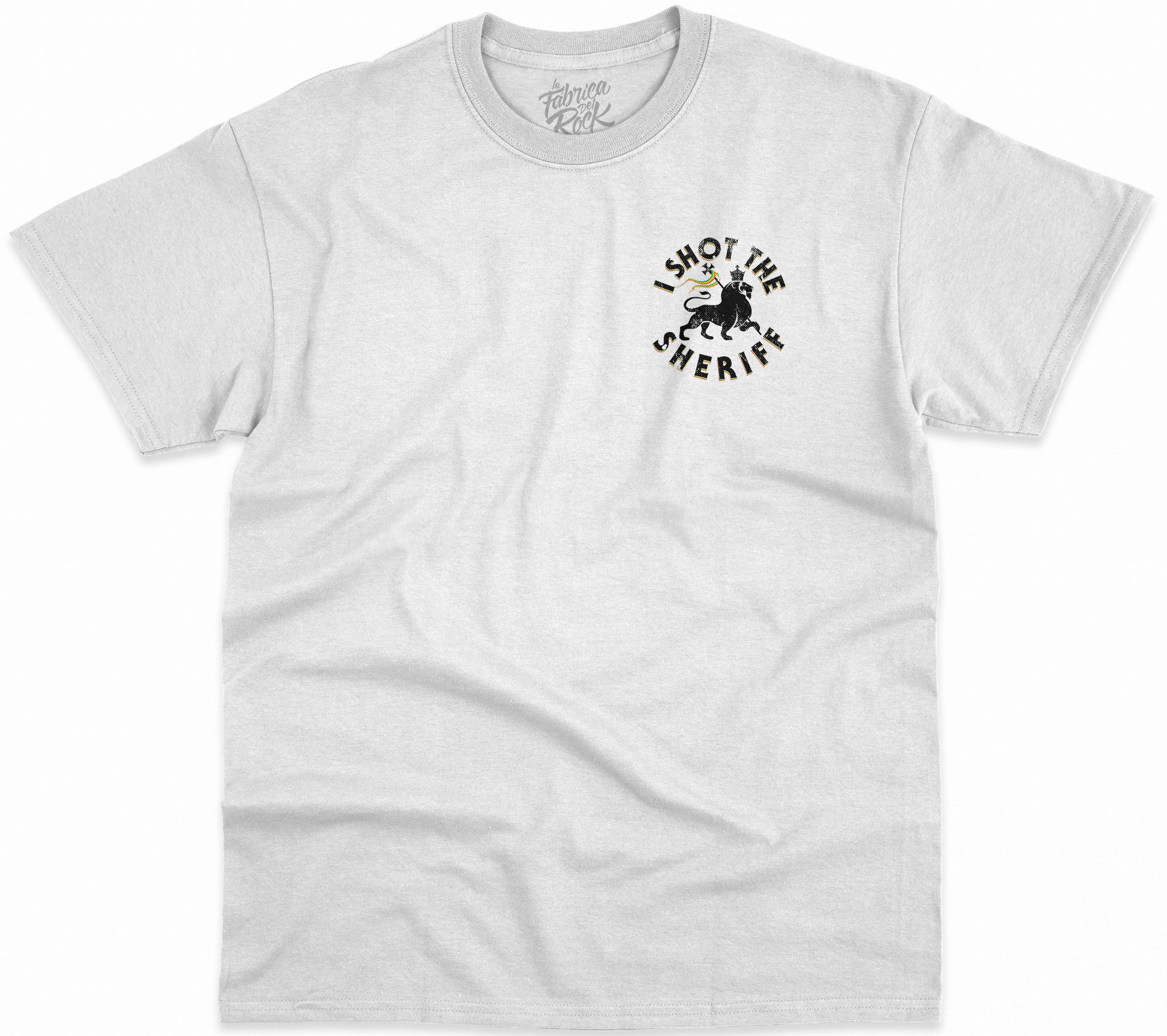 Polera Blanca 100% algodón, con cuello reforzado. Polera inspirada en la famosa cancion I shot the Sheriff de Bob Marley and the Wailers.