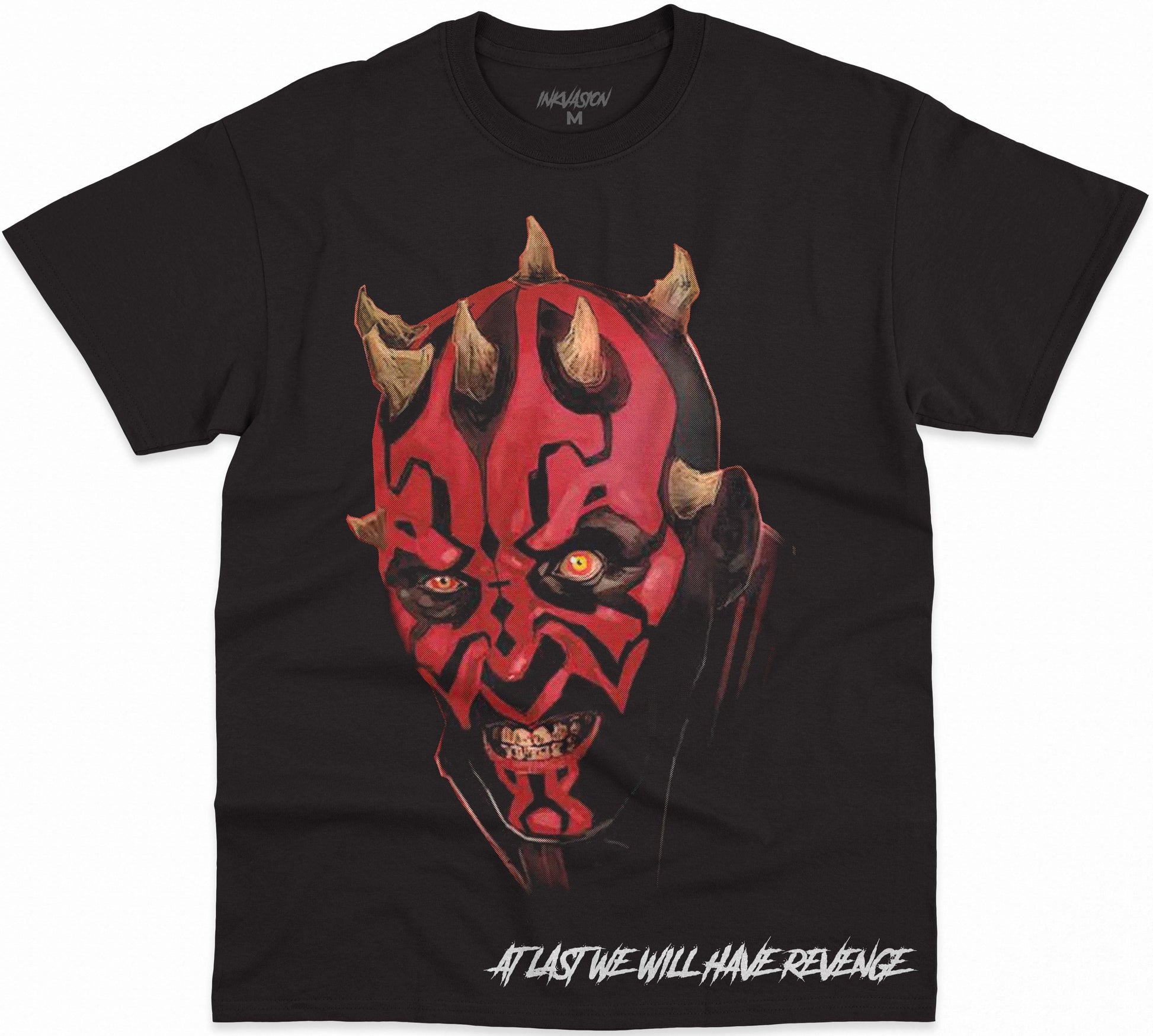 Polera Blanca 100% algodón, con cuello reforzado. Diseño inspirado en el personaje Darth Maul de las guerritas de las galaxias.