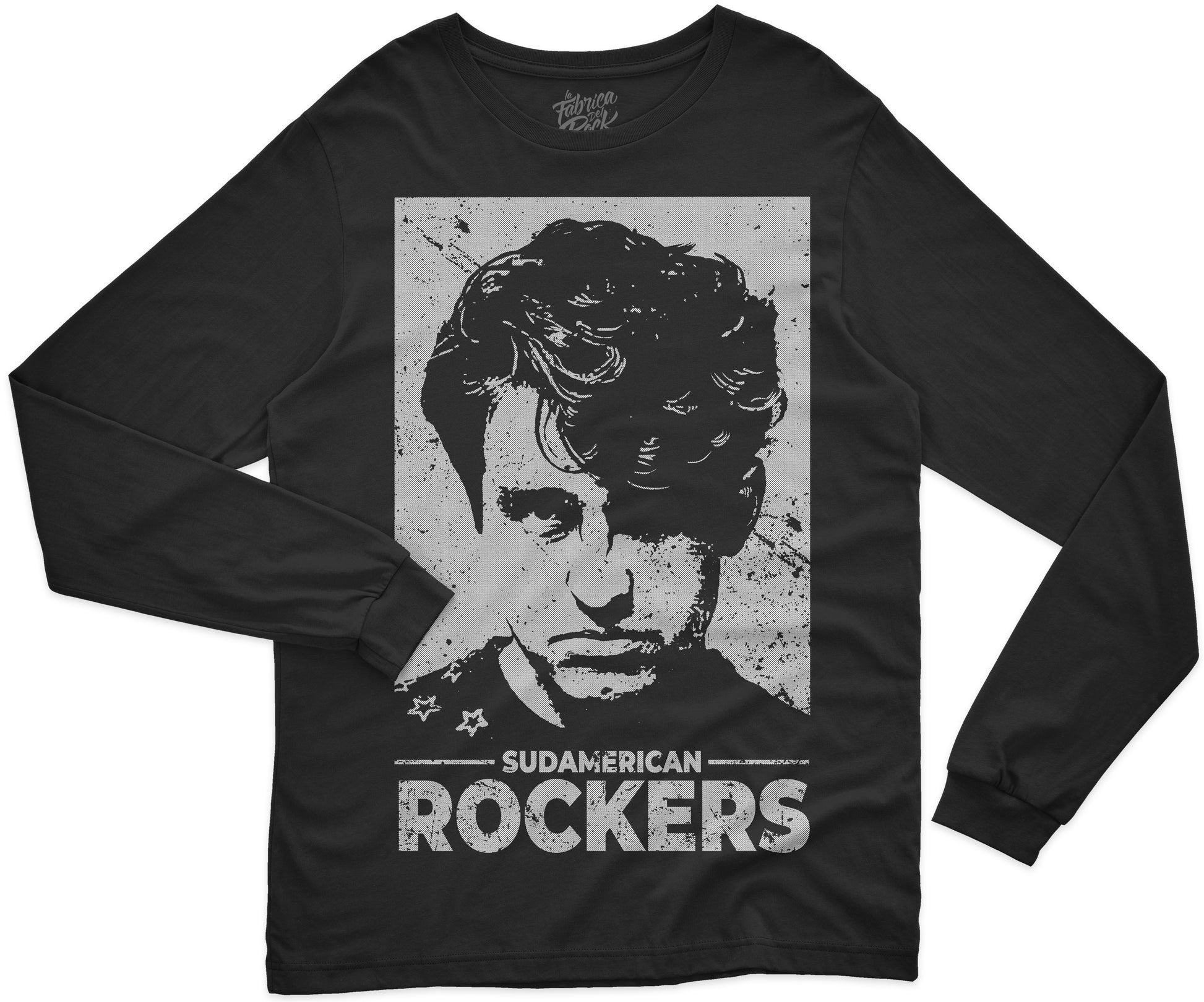 Polera negra de algodón 100% orgánico, con cuello reforzado inspirada en el vocalista del grupo chileno Los Prisioneros Jorge Gonzales y el ya himno Sudamerican Rockers. Estampada impresión dtf con tacto casi nulo.