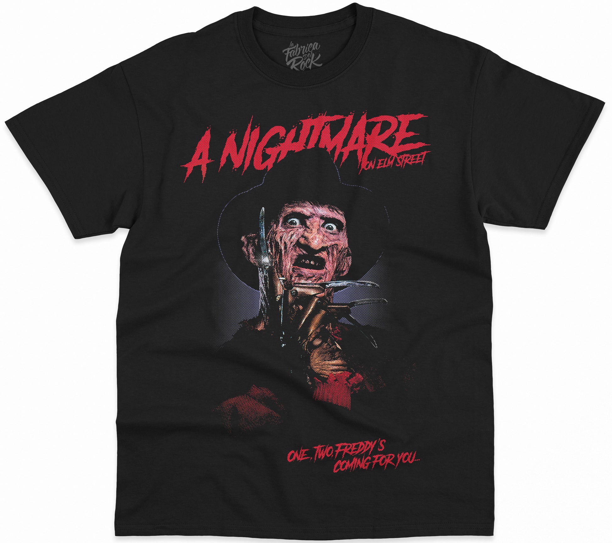 Polera negra 100% algodón orgánico, con cuello reforzado. Diseño inspirado en nuestra pelicula de terror favorita de la infancia: Pesadilla en la calle Elm y el villano Freddy krueger